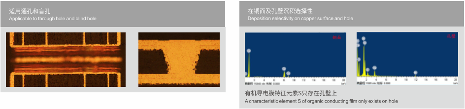 选择性有机导电膜(SOC)是在线路板孔壁的树脂及玻纤上选择性沉积一层导电性高分子膜。在铜面不成膜,替代传统的化学铜,在电路板层间能起导通作用。电镀时在SOC膜上面快速沉积一层完整的铜面,增强层间互连作用。SOC可用于高多层通孔板、FPC板、HDI板。